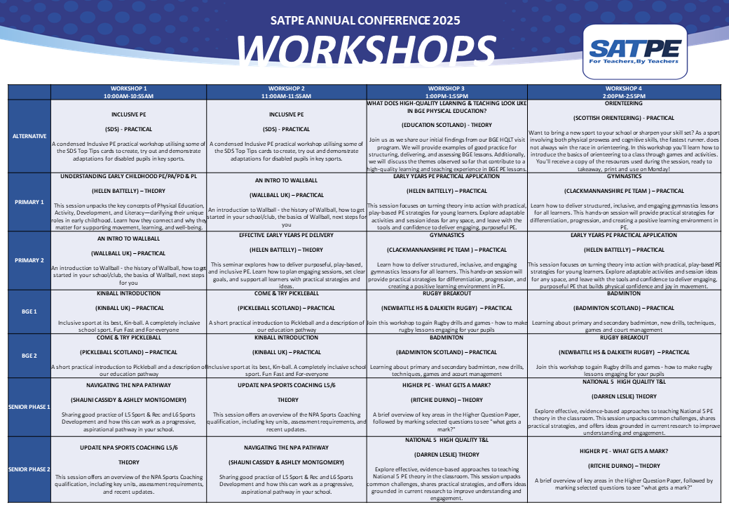Our annual SATPE Conference which takes place on Saturday 4th October in Larbert High School, 9.00 am – 3.30 pm It is a fantastic day of professional learning and networking with a host of workshop and marketplace providers present. Our conference is a showcase of how important teachers view PE, how dedicated they are to our subject, and the enjoyment found in delivering Physical Education to improve the health and wellbeing to young people across Scotland. Our conference theme this year is Find Your PurposE and hope to help teachers find purpose and new ideas and motivations to support the delivery of high quality of Physical Education and help pupils find their PE Purpose